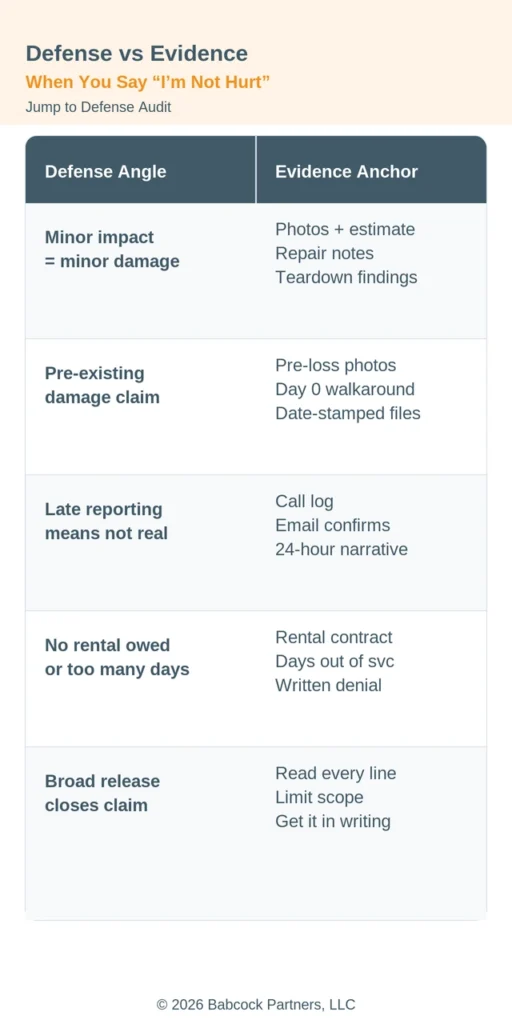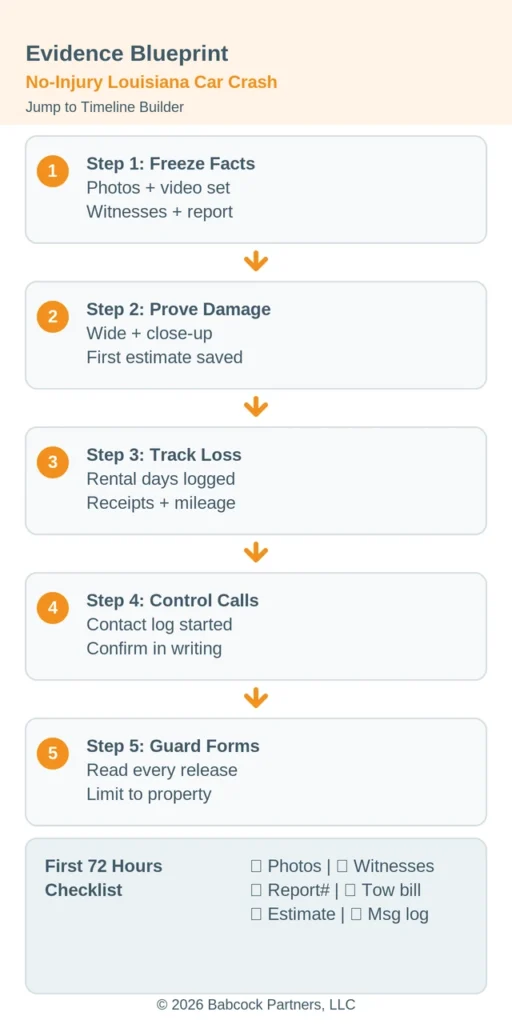 Also, “not hurt” is a snapshot in time, not a permanent fact, so listen to your body and get checked if symptoms show up later. Even if you never develop injuries, the best no-injury claims still start with the same disciplined proof file: photos, documents, and a consistent timeline.