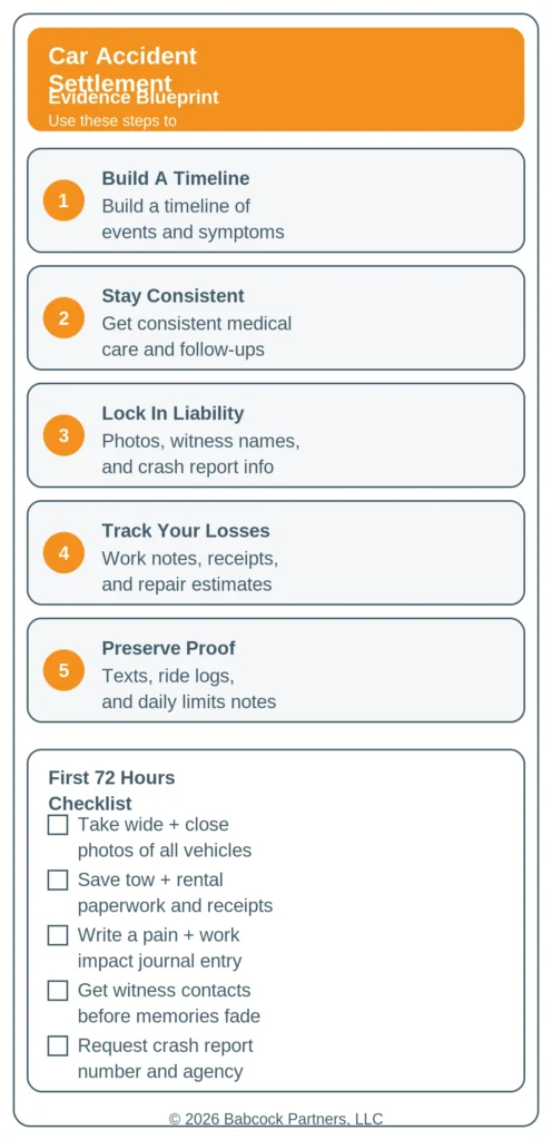 A strong settlement file reads like a timeline that a stranger can understand in five minutes. The best timeline connects the crash, the first symptoms, care decisions, and work or home limitations without missing weeks.