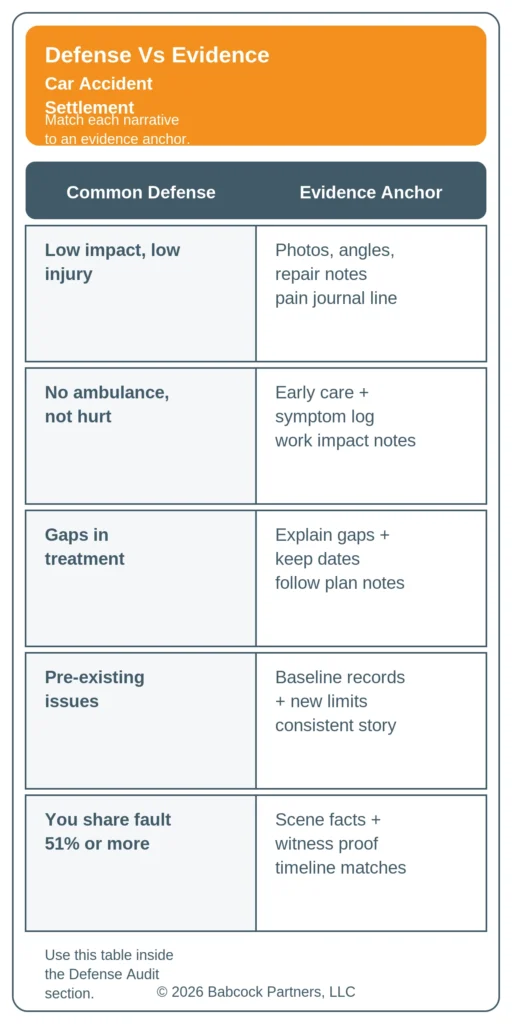 Most settlement negotiations revolve around a small set of recurring defense themes. If you know them early, you can document the missing piece instead of arguing in circles later.