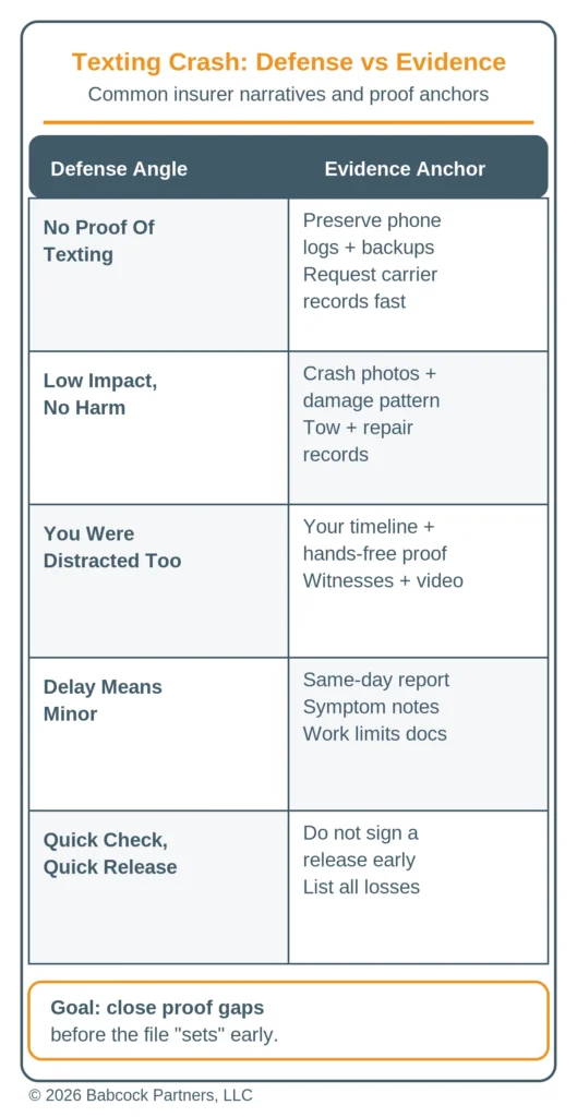 Insurers often respond to texting allegations with a short list of repeat defenses meant to create doubt and reduce value. You can counter most of them by building the file around objective anchors like video, phone records, and a clean timeline.