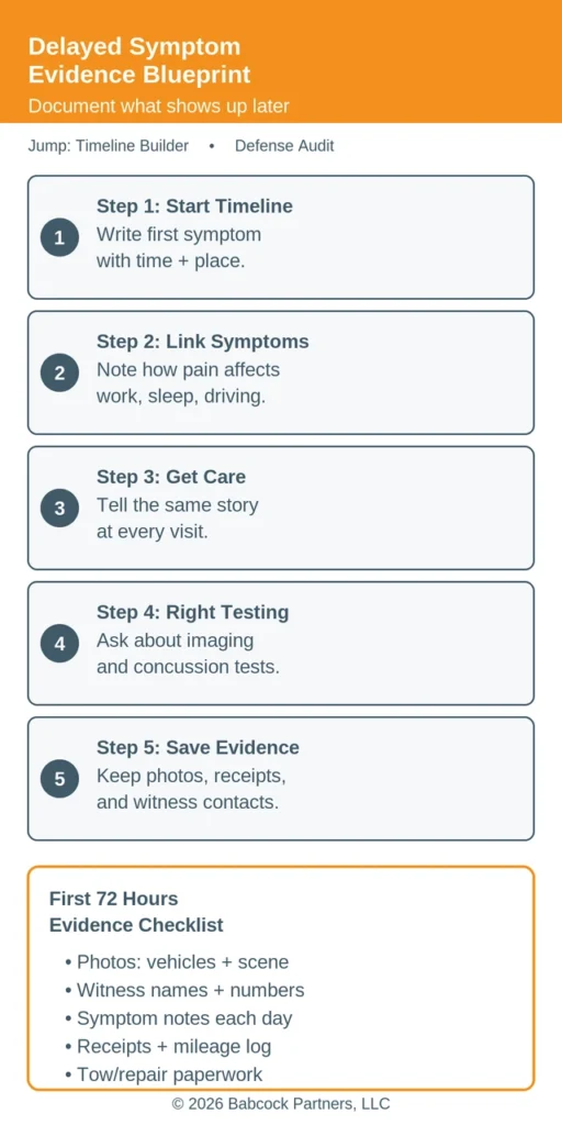 Delayed symptom cases are won or lost on documentation, not drama. We see the strongest files when the medical notes, daily function limits, and crash evidence tell the same story.