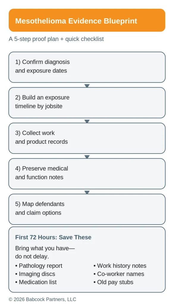 Our approach is to treat lawyer-selection as an evidence project first and a paperwork decision second. We are not built for volume. We are built for leverage. Speed + evidence preservation + insurer-insider knowledge + trial-ready preparation = The Babcock Benefit. In mesothelioma cases, leverage often comes from how quickly your team locks down worksite and product proof before it disappears.