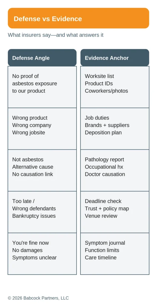 Most mesothelioma defense strategies aim to create doubt about exposure, product identification, timing, or causation, even when the diagnosis is clear. That is what we mean by leverage when we say you close the proof gaps before an insurer or defendant writes the story for you.