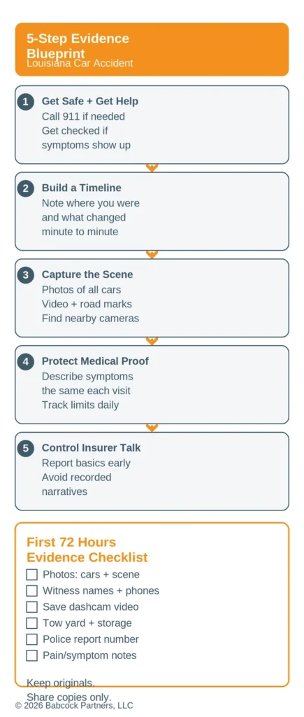 You keep evidence by treating the first 72 hours like a preservation window: photos, video, witnesses, and vehicle condition can change fast. A simple, repeatable checklist beats good intentions every time.