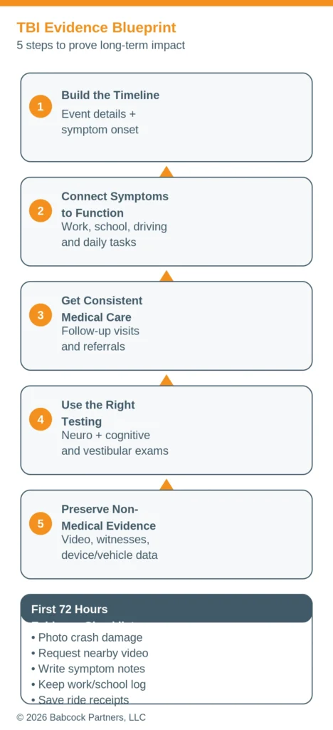 You prove long-term traumatic brain injury (TBI) effects by building a clean, dated story that starts with the event and ends with specific daily-life limitations. The goal is not to be dramatic; the goal is to be consistent, because insurers look for gaps and contradictions.