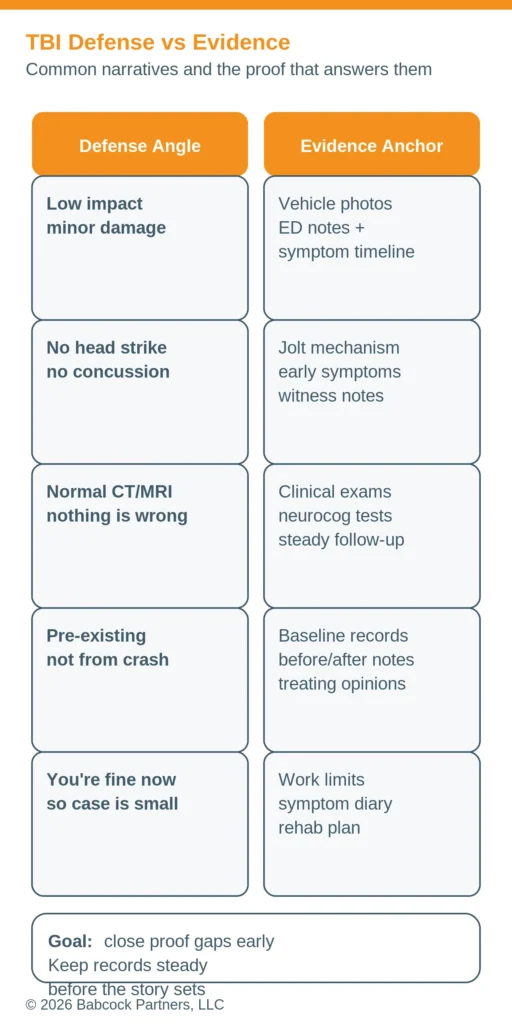 Insurance defenses in traumatic brain injury (TBI) cases usually focus on a simple narrative: the crash was minor, the scans were normal, and your symptoms come from something else. You can counter that narrative by matching each defense angle with a specific, dated record anchor.