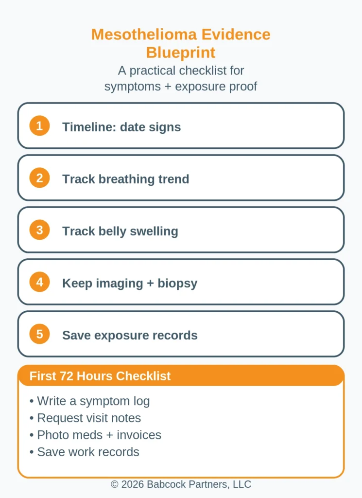 Mesothelioma is rare, and the symptoms can look like more common conditions at first. The CDC’s mesothelioma basics lists chest pain, coughing, and shortness of breath as common pleural symptoms, while abdominal swelling and nausea can happen when the abdomen lining is involved. Because symptoms may be vague early, a simple documentation plan helps your doctors and also protects your legal options if asbestos exposure becomes part of the story.