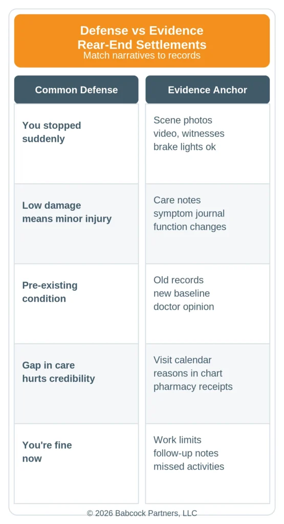 Insurers usually do not deny a rear-end collision settlement out of nowhere; they look for a narrative that creates doubt and then ask for records that support that narrative. If you plan for the narratives early, you can gather the records that shut them down.