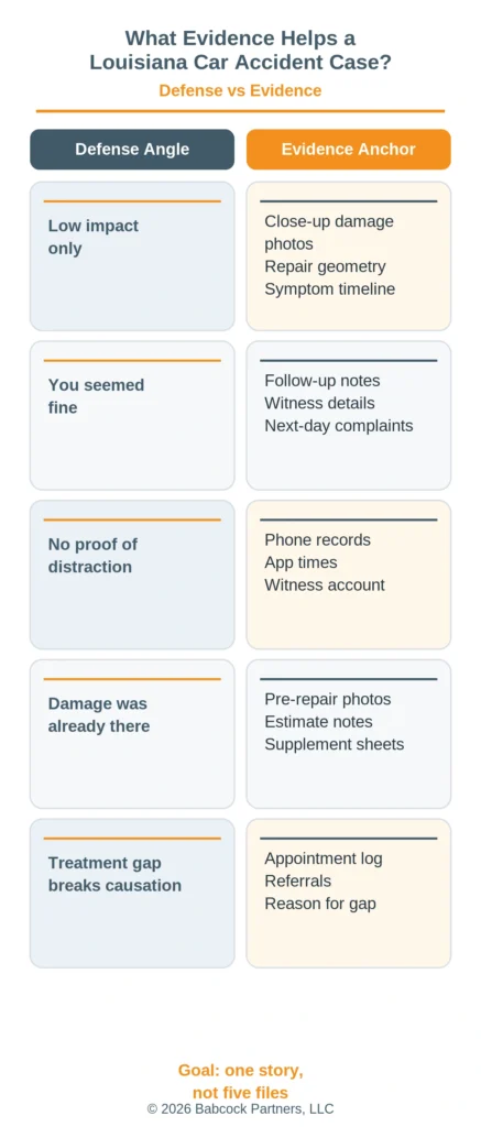 A Louisiana car accident case usually turns on records, timelines, and preserved physical proof. The strongest files do more than show a crash happened; they connect fault, injury, and money loss in one clean story. This guide narrows the issue to evidence, while our Baton Rouge car accident page covers the broader claim path. If that sounds more disciplined than a normal intake, The Babcock Benefit is that we pressure-test the file before the insurer does.