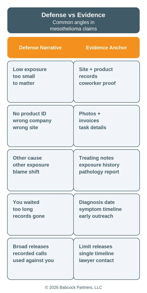 Defendants and insurers usually challenge mesothelioma claims by attacking the exposure story, the product identification, or the timing of the claim. The practical response is to identify the likely “proof gaps” early and gather evidence that answers them directly.